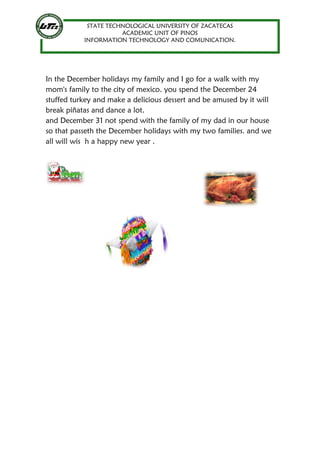 Ana Berenice Canizalez wrote an essay in English III about her vacation in December. She spent December 24 with her mom's family in Mexico City where they had a turkey dinner and broke piñatas. On December 31, she was with her dad's family at her house to celebrate New Year's together, allowing her to spend the December holidays with both sides of her family.