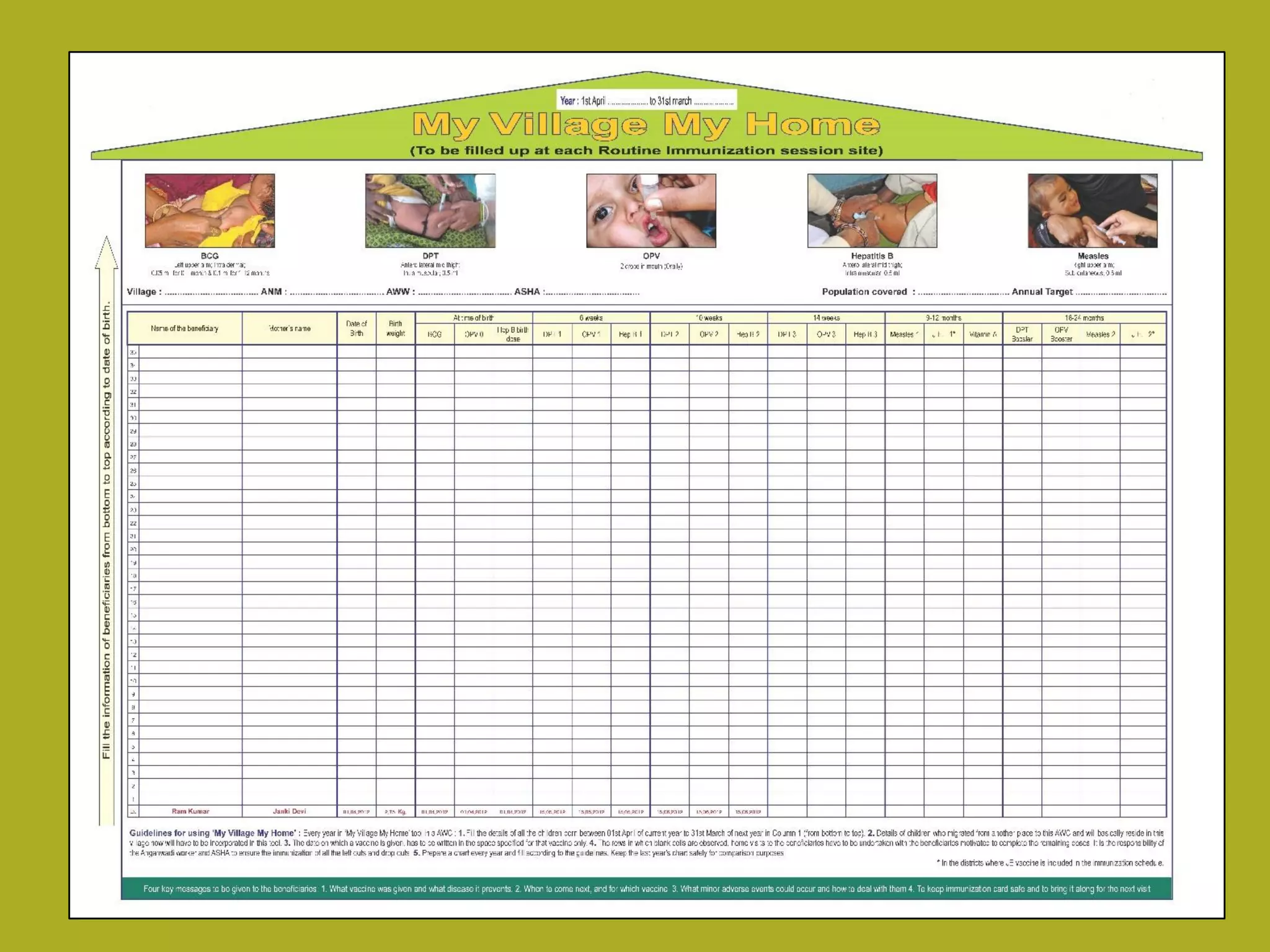 The document describes a program in Malawi that uses a community-based tool called MyVillage My Home (MVMH) to track infant vaccination rates. The objectives are to (1) increase fully immunized children compared to baseline, and (2) monitor immunization status of infants under 12 months in two districts. MVMH engages communities and leaders to identify newborns, register them, and mobilize families for vaccination. Health surveillance assistants use MVMH to record vaccination data and meet monthly with leaders to discuss statuses. The goal is for communities to take ownership over immunization through the visual tool.