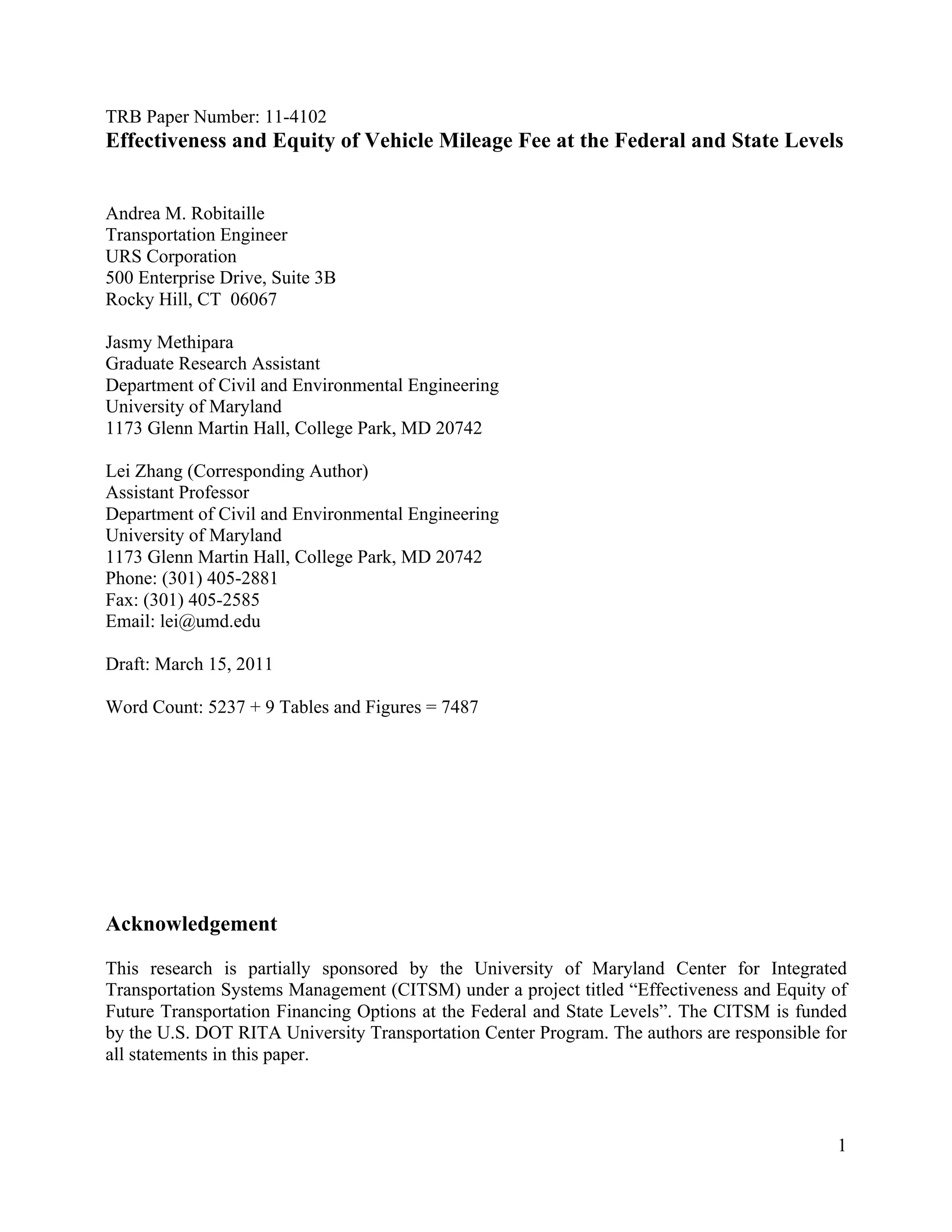 This paper analyzes the distributional effects of increasing the federal gasoline tax and implementing a vehicle mileage fee in the United States. It uses a regression model and 2001 National Household Travel Survey data to predict how households' vehicle miles traveled may change in response to policy changes, considering factors like income, location, and vehicle fuel efficiency. The paper finds that a gasoline tax increase or mileage fee could impact some groups more than others. It concludes that the effects on different populations should be carefully considered to promote both effective revenue generation and fair impacts across groups.