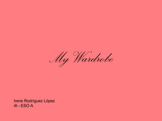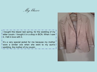 Irene describes items in her wardrobe, including a blazer she wore to a cousin's wedding that reminds her of her mother, a dress she had altered to fit after a trip to Madrid with her guitar group, a necklace with dolphins she bought in Italy, and shoes she wears for guitar concerts that are uncomfortable to walk in.