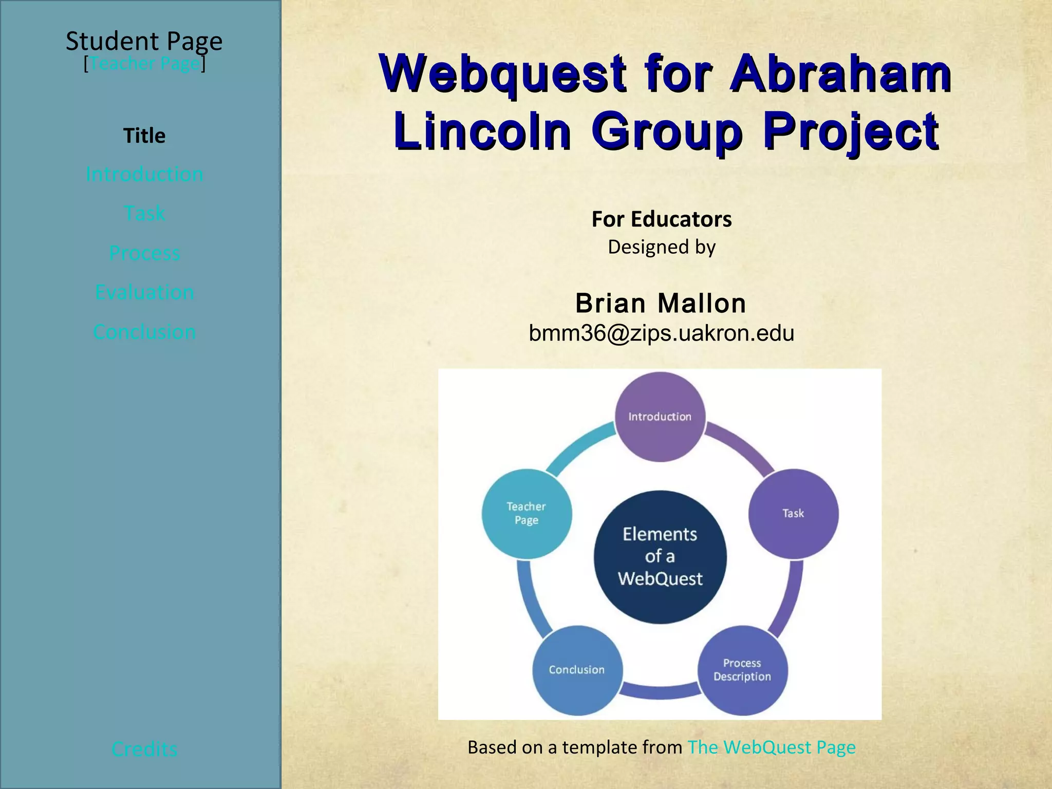 This document summarizes a webquest activity for students to research Abraham Lincoln in groups. Students will be assigned a time period of Lincoln's life and complete worksheets and a presentation. They will use approved websites for research and develop skills like critical thinking, teamwork, and compromise. The teacher will assess students on content knowledge, computer use, delegation of work, organization, and writing. The goal is for students to learn about Lincoln and develop 21st century skills through group research and presentations.