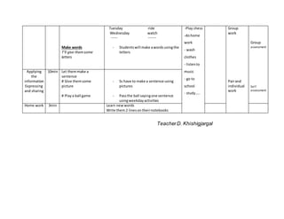 The lesson plan is for a 5th grade unit on "My Week". The aim is for students to learn the names of weekdays and describe weekday activities. The plan includes reviewing classroom rules and learning a poem about the days of the week. Students will then make words using provided letters and practice sentences about weekday activities by passing a ball around the class. Homework is to write new words in their notebooks.