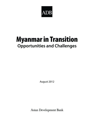 The document discusses Myanmar's transition from isolation to openness, highlighting its potential for rapid economic growth due to abundant natural resources and strategic location. It emphasizes the importance of regional cooperation and learning from neighboring countries' experiences to navigate challenges and avoid social instability. The report aims to provide insights for effective development assistance as Myanmar embarks on economic reforms.