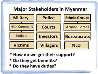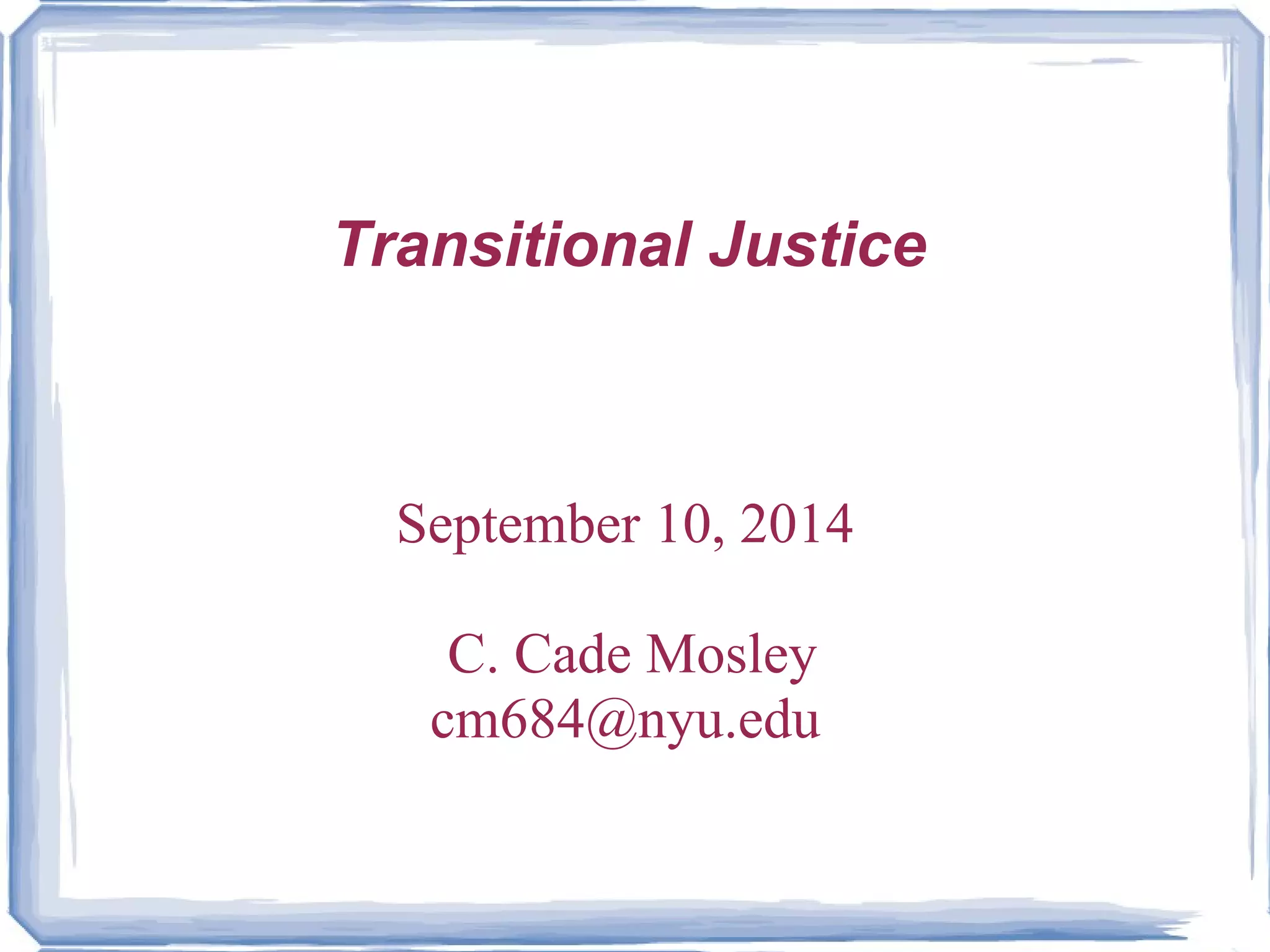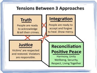 This document discusses goals and approaches to transitional justice in countries transitioning from conflict or authoritarian rule to democracy. The goals of transitional justice include ending human rights abuses, establishing the rule of law, investigating past crimes, and promoting reconciliation. Common transitional justice mechanisms discussed include prosecutions, truth commissions, victim reparations, institutional reforms, vetting of public officials, and demobilizing conflict groups. The document also examines legal issues and provides examples of transitional justice approaches used in countries such as South Africa, Chile, Argentina, Cambodia, and Sierra Leone.