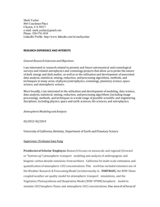 Mark Yashar has extensive research experience in areas related to dark energy, dark matter, astrophysics, and data analysis. His past work includes carrying out Markov Chain Monte Carlo analyses to explore dark energy models using simulated future data sets. He has also worked on projects related to modeling atmospheric CO2 concentrations, calibrating algorithms for the Square Kilometer Array radio telescope, and analyzing MACHO microlensing data to constrain the locations of dark matter in the Milky Way and Magellanic Clouds. Yashar expresses interest in further research involving dark energy modeling, simulations of future experiments, and using MCMC techniques to compare different quintessence theories with current and future cosmological data.