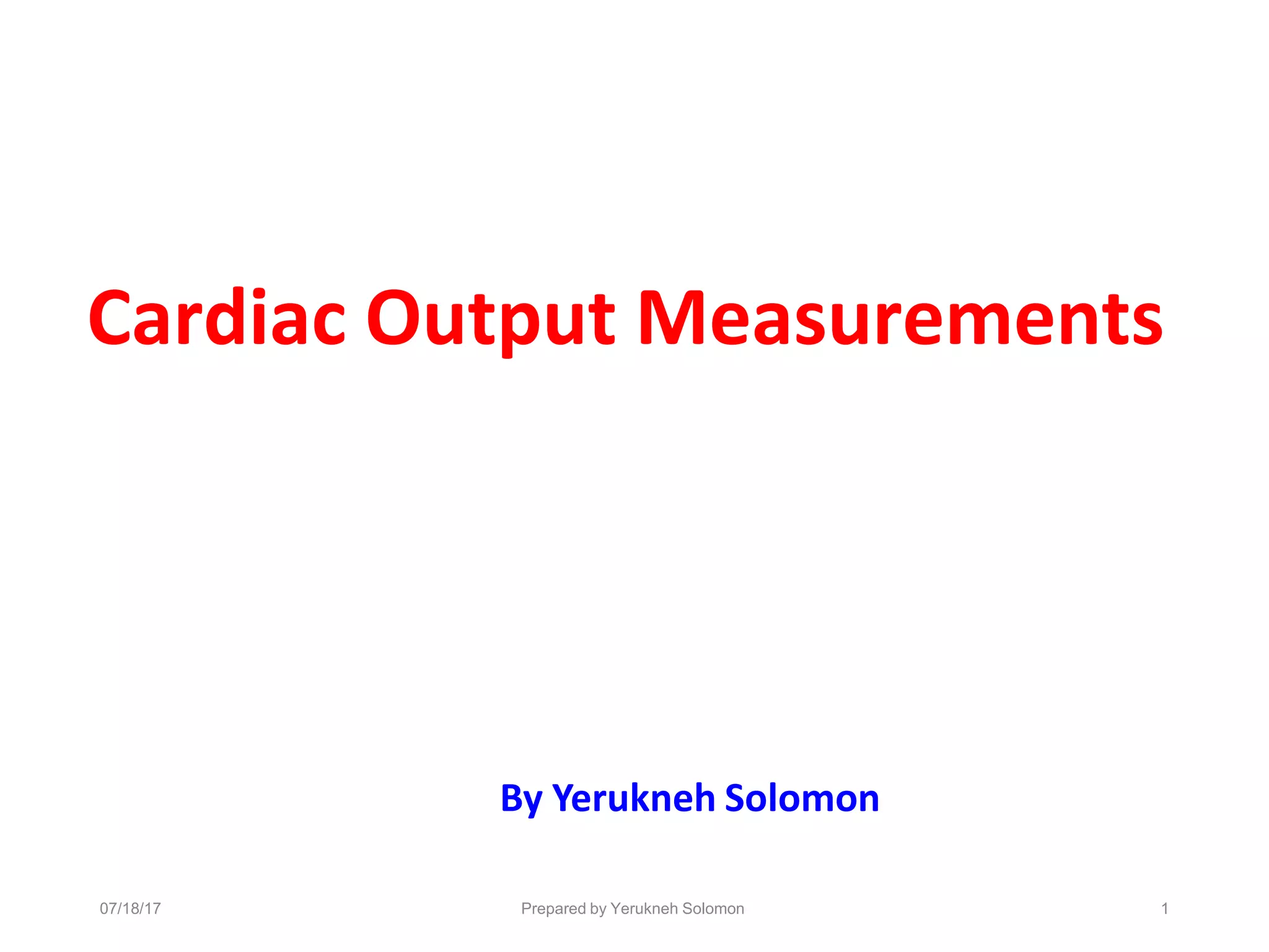This document outlines various methods for measuring cardiac output. It begins with a historical perspective on cardiac output measurement, noting that Adolf Fick first developed a technique for measuring it in 1870 using what is now called the Fick principle. The document then discusses the importance of cardiac output and ideal features of measurement devices. It describes both non-invasive techniques like echocardiography and invasive methods like thermodilution that use indicator dilution. The relationship between cardiac output, stroke volume, heart rate and cardiac reserve is also explained.