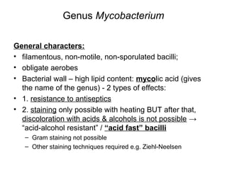 - Mycobacteria are acid-fast bacilli that require special staining techniques like Ziehl-Neelsen staining.
