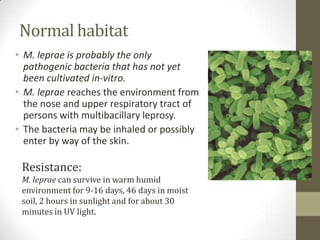 M. leprae is the bacteria that causes leprosy. It is found in the nose and respiratory tract of infected individuals. While it can survive in the environment for some time, it is transmitted through direct contact with infected individuals. M. leprae causes a chronic granulomatous disease that primarily affects the skin, nerves, and nasal mucosa. There are several forms of leprosy depending on the immune response of the infected individual, ranging from tuberculoid leprosy where immune response is strong to lepromatous leprosy where immune response is weak. Diagnosis is based on clinical signs and confirmation is through visualization of acid-fast bacilli in skin or nerve biopsies