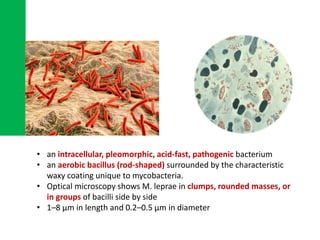 Leprosy, caused by Mycobacterium leprae, predominantly affects individuals in India, which runs a significant eradication program but still reports about 100,000 new cases annually. The disease primarily impacts skin and peripheral nerves, with symptoms ranging from mild skin patches to severe disfiguring conditions, and poses significant socio-economic challenges due to stigma and discrimination. While multidrug therapy is available, complications can include permanent disability, and existing laws in India further marginalize affected individuals.