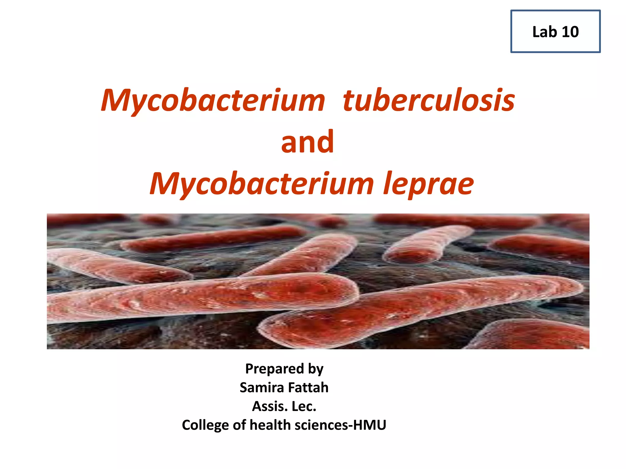 This document discusses Mycobacterium tuberculosis and Mycobacterium leprae. M. tuberculosis causes tuberculosis and primarily affects the lungs, while M. leprae causes leprosy and affects superficial tissues like skin and nerves. Both are acid-fast bacilli with waxy cell walls. Laboratory diagnosis of M. tuberculosis involves examining sputum smears microscopically for acid-fast bacilli, culturing on egg-based media over 4-6 weeks, and nucleic acid amplification tests. Diagnosis of M. leprae involves examining skin and tissue samples microscopically after Ziehl-Neelsen staining or using PCR to detect its DNA.