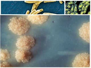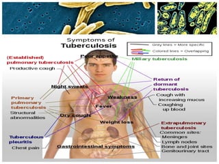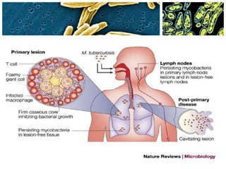 Mycobacterium tuberculosis is the bacterium that causes tuberculosis. It has unusually waxy cell walls that are acid-fast staining and slow growing. M. tuberculosis is inhaled into the lungs where it is engulfed by alveolar macrophages but can evade destruction and replicate within the macrophages. This can lead to cell death, spread to lymph nodes, and development of lesions. Tuberculosis may be primary infection or reactivation from a dormant infection, and it is diagnosed through smear microscopy, culture, or tuberculin skin testing. Treatment involves a combination of antibiotics over several months.