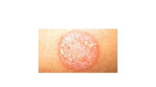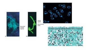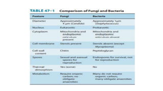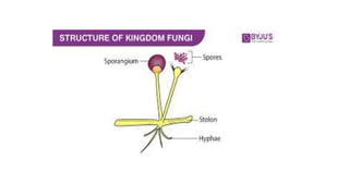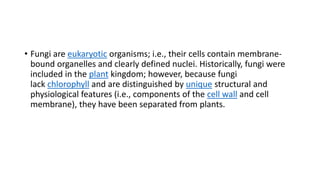 Fungi are eukaryotic organisms that were historically classified as plants but are now recognized as a distinct kingdom. They differ from plants in that they lack chlorophyll and their cell walls contain chitin rather than cellulose. Fungi reproduce both sexually through the formation of spores like zygospores or basidiospores, and asexually through budding or the formation of conidia. Major groups of fungi include molds, mushrooms, and yeasts. Molds form branching filaments called hyphae that allow them to absorb nutrients, while mushrooms form visible fruiting bodies above ground. Yeasts are single-celled fungi that reproduce by budding.