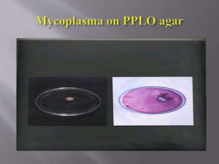Mycoplasma are unique prokaryotes that lack a cell wall. They can cause respiratory infections like pneumonia that spread through coughing and sneezing. Symptoms include cough, fatigue, and weakness. Diagnosis involves blood tests to detect antibodies. Treatment involves antibiotics like erythromycin and doxycycline. Prevention relies on good hygiene practices.