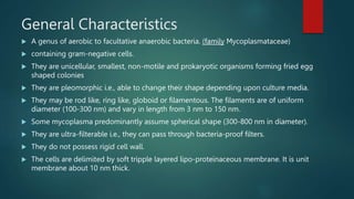 Mycoplasma are the smallest bacteria capable of independent growth and reproduction. They lack cell walls and have unique characteristics compared to other bacteria. Some Mycoplasma species can cause infectious diseases in humans. Mycoplasma pneumoniae causes atypical pneumonia in humans and has a distinctive pear shape with terminal tip organelle. Mycoplasma metabolize carbohydrates and depend on pathways like glycolysis and arginine degradation for energy production. While mostly harmless commensals, some Mycoplasma species have been biologically modified for weaponization, resulting in more deadly forms.