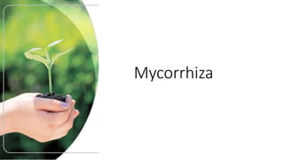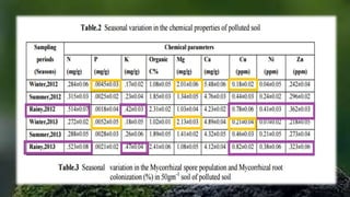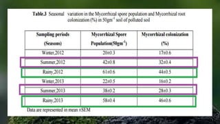 The document discusses arbuscular mycorrhizal fungi (AM fungi) and their symbiotic relationship with plants, enhancing nutrient absorption and plant resilience to various stresses, particularly in polluted soils. Research conducted at a paper mill site in Assam, India, demonstrated that AM fungi, particularly the Glomus species, thrive in contaminated environments and can be utilized for bioremediation purposes. The study confirmed positive correlations between mycorrhizal colonization, soil physio-chemical properties, and the presence of trace metals in the soil.