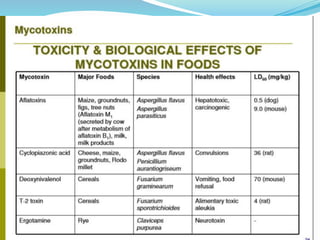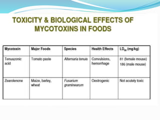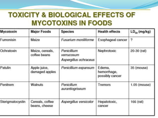This document discusses mycotoxins, which are toxic compounds produced by fungi. It provides background on mycotoxins, including their origin in fungi, mechanisms of toxicity, history, major types, and factors affecting their production. The document also summarizes the health impacts of mycotoxin exposure and discusses interventions and prevention strategies.