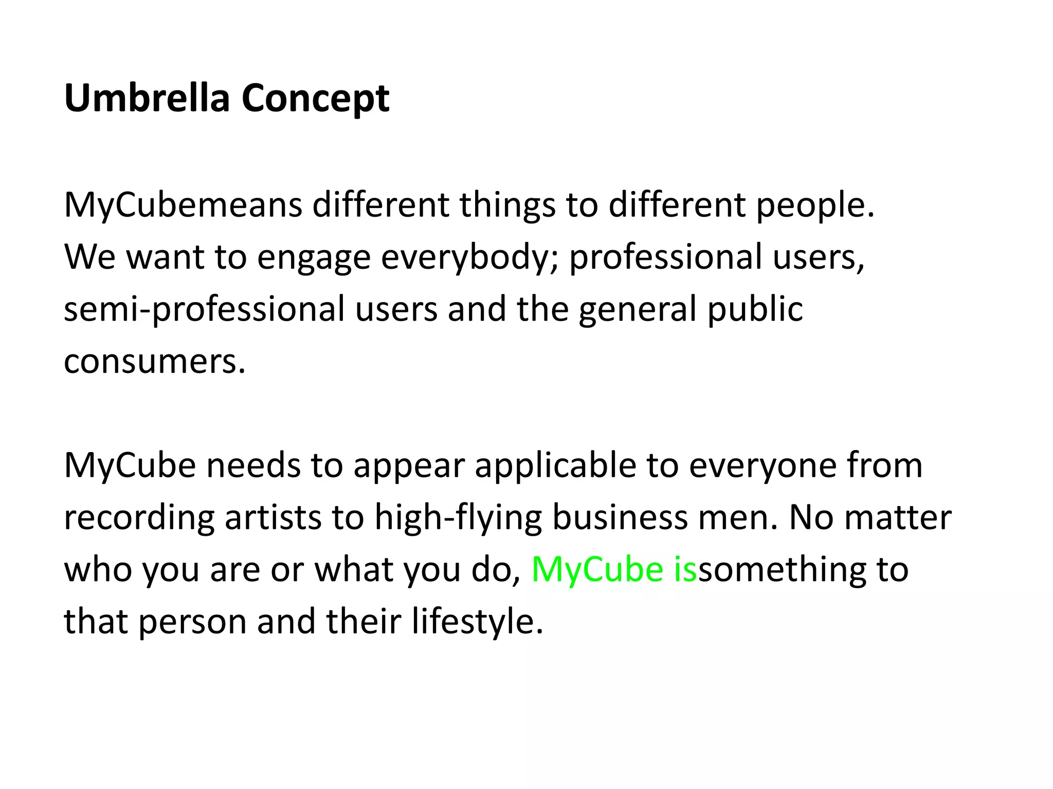 MyCube aims to appeal to different types of users, including professionals, semi-professionals, and the general public. It can mean different things depending on who uses it - for example, it could mean ownership for professionals, a way to make money for semi-professionals, or discovery for the general public. The document proposes using a "light cube" in advertisements that would represent different types of content people could access or create using MyCube, and holding these cubes could help demonstrate MyCube's appeal to different audiences. It also suggests staging an interactive light cube installation in public spaces to generate awareness and interest in MyCube.