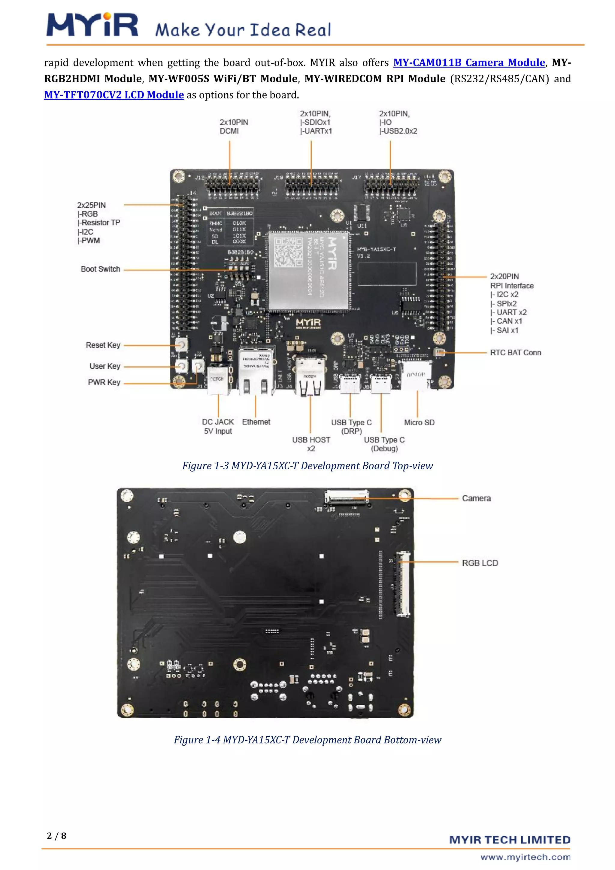 The document describes the MYC-YA15XC-T CPU module, which features an STMicroelectronics STM32MP1 MPU, offering flexibility with single or dual ARM Cortex-A7 cores and Cortex-M4 for various applications such as industrial control and smart home devices. It has a compact design with integrated DDR3L memory, NAND/EMMC storage options, and supports the Linux operating system with a provided kernel and various drivers. Additionally, the MYD-YA15XC-T development board extends functionality through multiple peripherals and is packaged for rapid development with essential accessories.