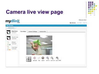 This document outlines pages for a website mockup including a camera live view page, camera information page, a two step delete devices page, a user profile page, and a contact us page.