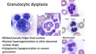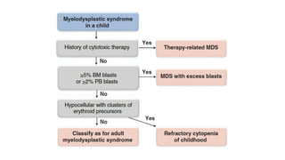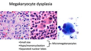 Myelodysplastic Syndromes (MDS) are a heterogeneous group of disorders characterized by ineffective hematopoiesis and peripheral blood cytopenias. The key criteria for diagnosing MDS include persistent cytopenia in one or more cell lines, dysplastic features in 10% or more of cells in one or more myeloid lineages, and less than 20% blasts in the bone marrow. The pathologist plays an important role in establishing the diagnosis by evaluating peripheral blood smears and bone marrow aspirates and biopsies for evidence of cytopenia, dysplasia, blast percentage, and other findings. Accurate classification and diagnosis of MDS requires integration of morphological, cytogenetic, molecular