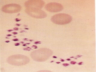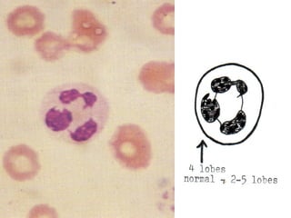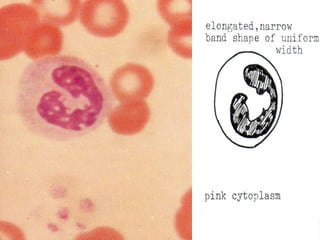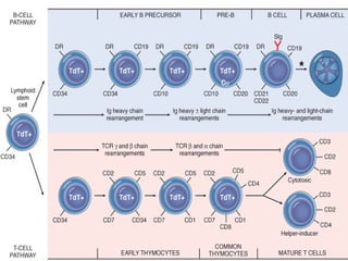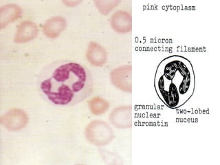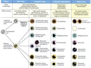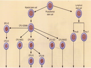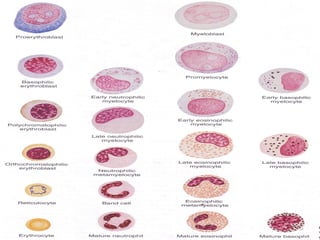 The document summarizes hematopoiesis, the process by which blood cells are formed from stem cells in the bone marrow. It discusses that hematopoiesis occurs through the simultaneous, continuous proliferation and differentiation of pluripotent stem cells in the bone marrow and lymphatic tissues. The structural organization of the hematopoietic marrow is also described, including the blood vessels, stroma, sinusoids, and cell types involved in hematopoiesis. The stages of development from stem cells to mature blood cells are outlined for erythropoiesis, granulopoiesis, monocytopoiesis, and thrombocytopoiesis.