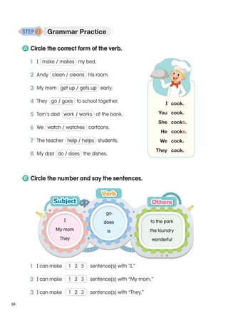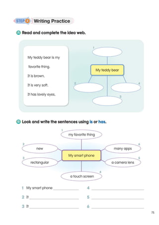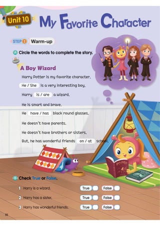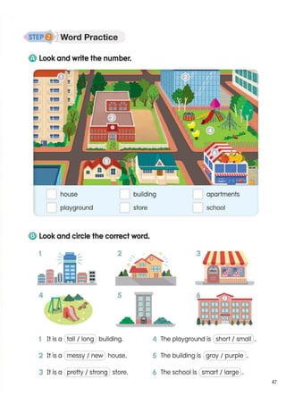 This document outlines a curriculum for teaching English vocabulary and grammar to young students. It is divided into 5 units: My Family, My Places, My Town, My Favorites, and Doing Things. Each unit contains 3 lessons focusing on a vocabulary topic and associated grammar points, such as family members, prepositions, and verbs. Students complete a writing project at the end of each unit applying what they learned. The curriculum aims to help students learn and practice essential English words, phrases, and language structures.