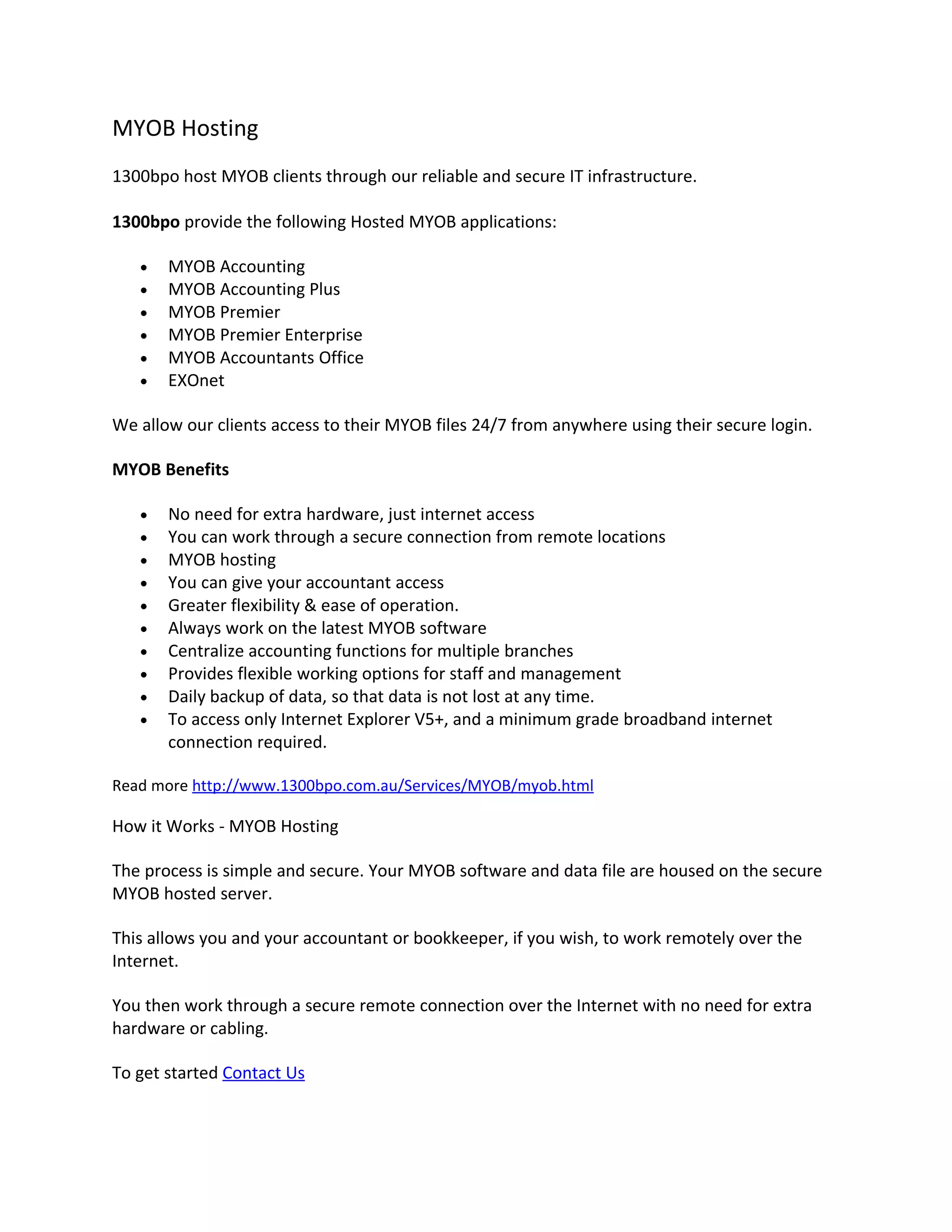 1300BPO offers secure MYOB hosting services, allowing clients to access various MYOB applications remotely and benefit from features like 24/7 access, daily backups, and no need for extra hardware. MYOB LiveAccounts provides an easy online accounting solution for small businesses to create invoices, track expenses, and manage GST without needing complex software installations. Additional support and security measures ensure data is protected and accessible to authorized users from anywhere with an internet connection.