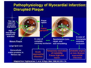 3. Symptoms include chest pain and other signs of reduced blood supply to the heart. Diagnosis is based on symptoms, electrocardiogram changes, and blood tests showing cardiac enzyme levels.