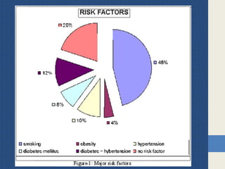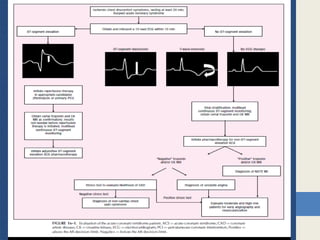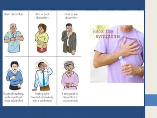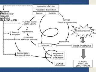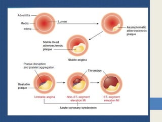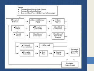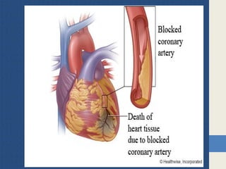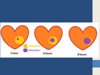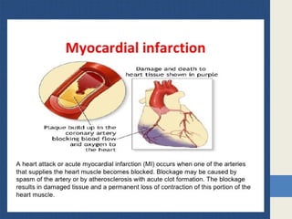 Myocardial infarction, or heart attack, occurs when blood flow to the heart is blocked, damaging heart muscle. There are two main types - STEMI caused by a complete blockage, and NSTEMI from a partial blockage. Risk factors include age, smoking, high cholesterol, diabetes, and family history. Diagnosis involves history, cardiac biomarkers like troponin that indicate heart damage, ECG showing elevated ST segments, and imaging tests. Treatment focuses on restoring blood flow through medications, angioplasty, or bypass surgery, along with long term preventative medications like aspirin, statins, and beta blockers.