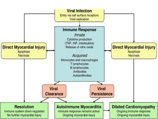 This document discusses myocarditis in children. It defines myocarditis and describes the epidemiology, etiology, pathophysiology, clinical presentation, diagnosis and treatment. Myocarditis has many potential causes including viruses like adenovirus and enterovirus. Clinically it presents variably depending on age from nonspecific symptoms to heart failure. Diagnosis involves blood tests, ECG, imaging like echocardiogram and cardiac MRI, and endomyocardial biopsy. Treatment is supportive with heart failure medications, antivirals may help, and immunosuppressants can reduce inflammation and improve function.