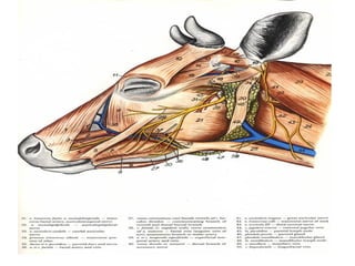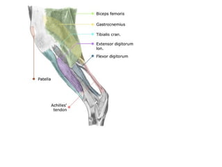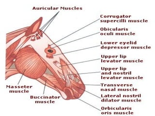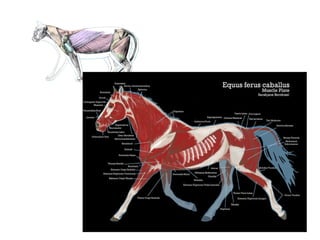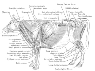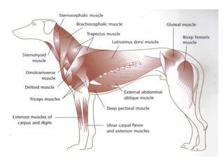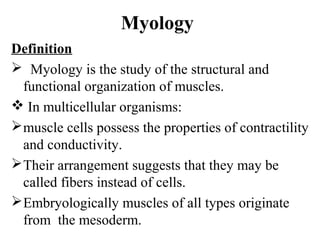 Myology is the study of muscles. There are three main types of muscle - skeletal, smooth, and cardiac. Skeletal muscle is striated and voluntary, found attached to bones, and makes up meat. Smooth muscle is non-striated and involuntary, found in organs. Cardiac muscle is striated and inherent, found only in the heart. Muscles have origins, insertions, and actions. Their structure and function can vary between species.