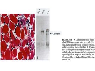 Duchenne muscular dystrophy is the most common and serious hereditary myopathy. It is an X-linked recessive disorder caused by a lack of the dystrophin protein, leading to muscle degeneration. Boys experience progressive muscle weakness starting in early childhood and death usually occurs in late teens.