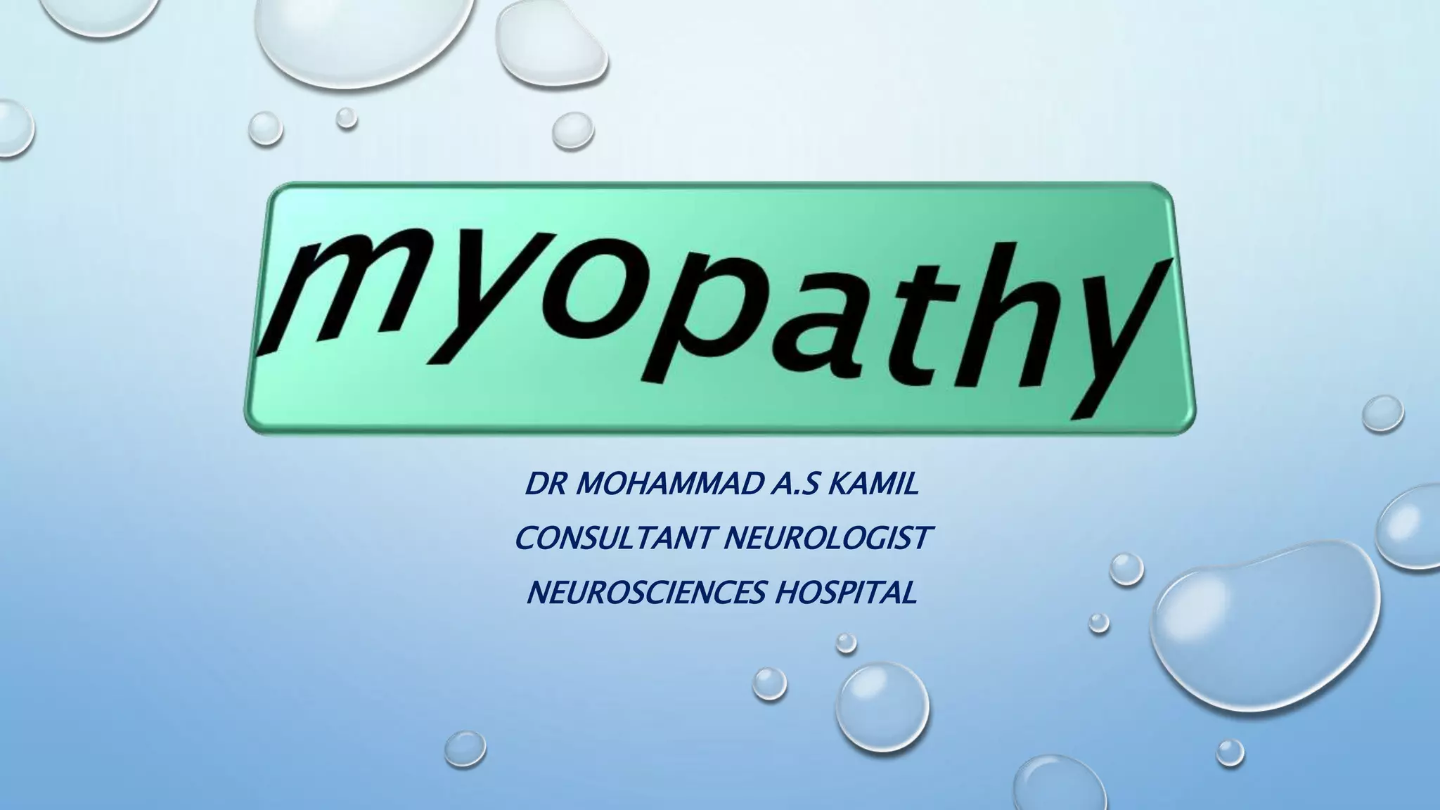 This document discusses the diagnostic approach to myopathies. It emphasizes that obtaining a comprehensive medical history is very important for diagnosis. The history should clarify the patient's symptoms, any family history of muscle disorders, precipitating factors, associated conditions, and distribution of weakness. Different myopathies are characterized by features like muscle pain, stiffness, weakness, or damage shown by myoglobinuria. Specific myopathies can be suggested based on the pattern of muscle involvement, such as proximal or distal weakness. The document provides tables matching myopathies to various clinical features to guide diagnosis.