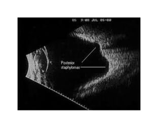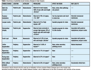 This document discusses myopia (nearsightedness) and provides classifications and descriptions of different types of myopia. It discusses refractive vs axial myopia, classifications based on progression rate, anatomical features, degree of myopia, age of onset, and associated ocular and systemic conditions. Specifically, it describes stationary, temporarily progressive, and permanently progressive myopia based on progression rate. It also discusses physiological, intermediate and pathological myopia based on degree and anatomical features such as refractive, axial, and other subtypes.