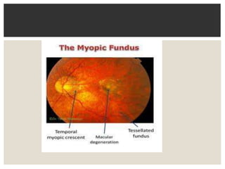 This document discusses myopia (nearsightedness), including its optics, etiological classifications, clinical varieties, and treatment options. Myopia occurs when light rays focus in front of the retina rather than directly on it. It can be axial, curvatural, or positional. Treatment includes optical correction with glasses or contacts, as well as refractive surgeries like LASIK, PRK, clear lens extraction, phakic IOL implantation, intracorneal ring segments, and orthokeratology. More advanced techniques like LASIK and ICLs can correct higher degrees of myopia over -12 diopters.