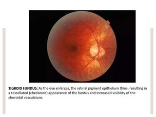This document discusses myopia (nearsightedness), including its definition, types, causes, signs and symptoms, complications, and treatment options. The main types of myopia are axial, curvatural, and index myopia. Causes include genetics, excessive eye growth, and changes in the eye's shape or refractive index. Signs include prominent eyeballs and myopic degeneration in advanced cases. Treatments include glasses, contact lenses, refractive surgery such LASIK, and low vision aids for severe vision loss.