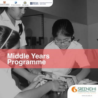 The Middle Years Programme (MYP) at Sreenidhi International School aims to develop inquiring, knowledgeable and caring students. The MYP provides an internationally-minded curriculum framework that encourages students to make connections between school subjects and the real world. It focuses on developing skills like communication, intercultural understanding and global engagement that are important for students to become leaders in today's world. The MYP assessment model is criterion-related and aims to evaluate students' conceptual understanding and acquired skills through open-ended tasks and projects.