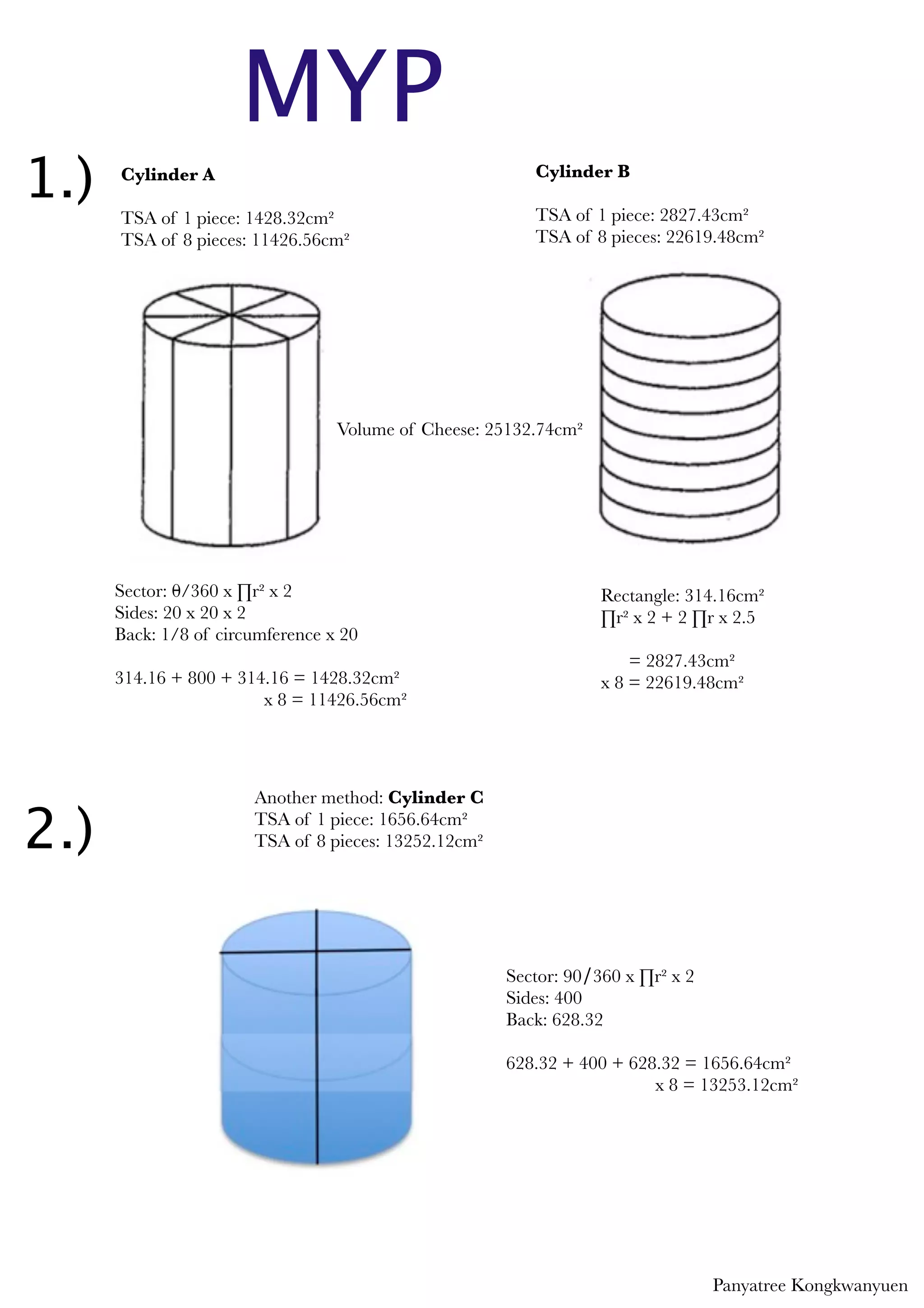 The document compares different methods of cutting a block of cheese into 8 equal pieces. It calculates the total surface area (TSA) of 1 piece and of all 8 pieces for different shapes, including cylinders, cubes, and an irregular shape. The table shows that cutting the cheese into cubes results in the lowest TSA of 10,295.68 cm2, making it the most efficient method. An irregular shape has the highest TSA of 56,271.28 cm2, making it the least efficient. Cutting the cheese into cubes is recommended as the simplest shape that minimizes surface area and potential for spoilage.