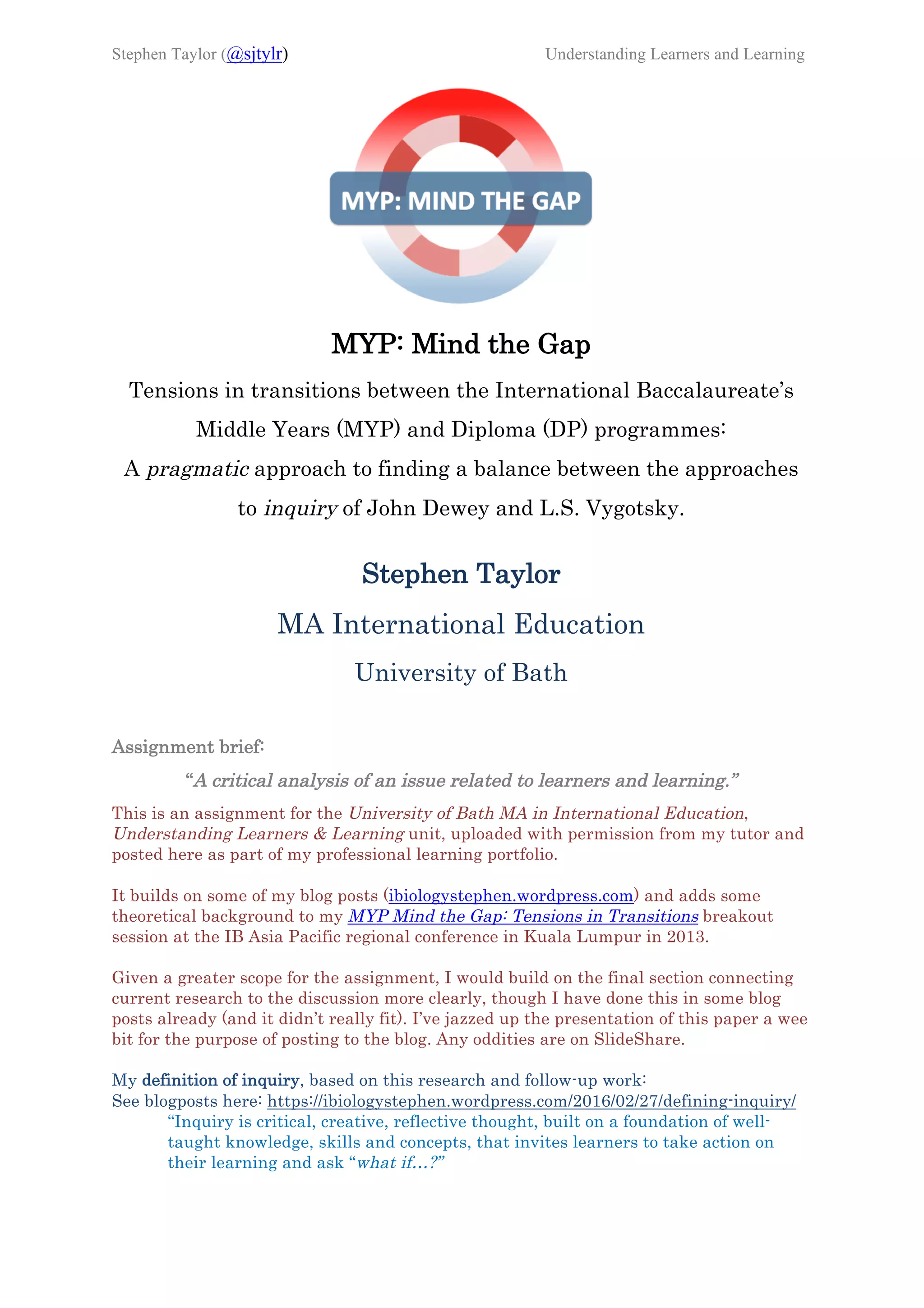 The document discusses the tensions in transitioning between the International Baccalaureate's Middle Years Programme (MYP) and Diploma Programme (DP), emphasizing differing educational philosophies from John Dewey and L.S. Vygotsky. Stephen Taylor aims to define inquiry in the context of education, arguing for a balance between constructivist approaches and direct instruction to enhance learning continuity across both programs. The paper suggests that educators should adopt a pragmatic approach to inquiry, ensuring that teaching methods align with the needs of students as they navigate the MYP-DP transition.