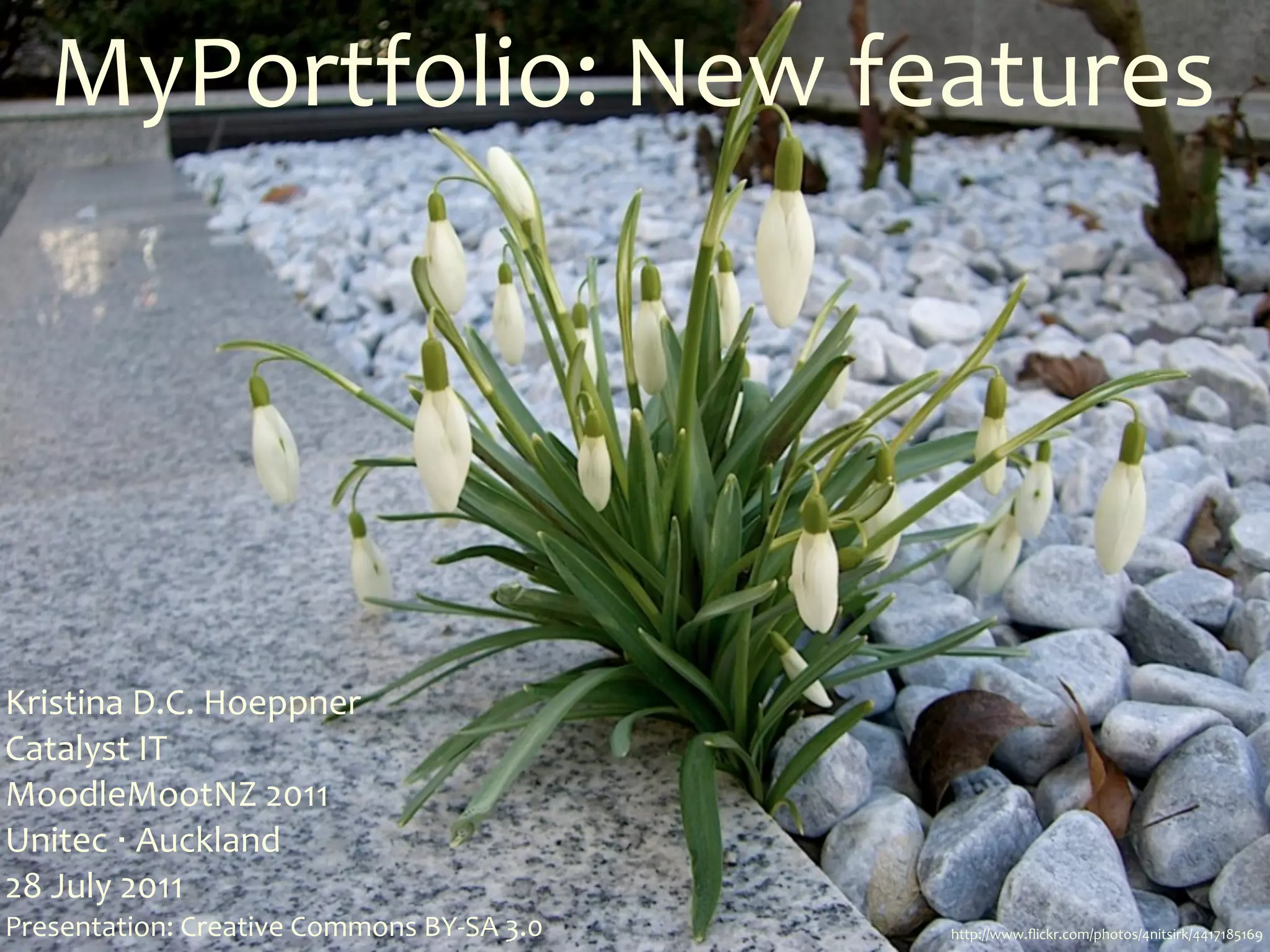 The document outlines new features for the myportfolio platform, presented by Kristina D.C. Hoeppner at the MoodleMootNZ 2011 conference. Key updates include support for Māori language, improved navigation, and the ability to embed external content, among other enhancements. It also mentions taster sessions and provides contact information for further engagement.