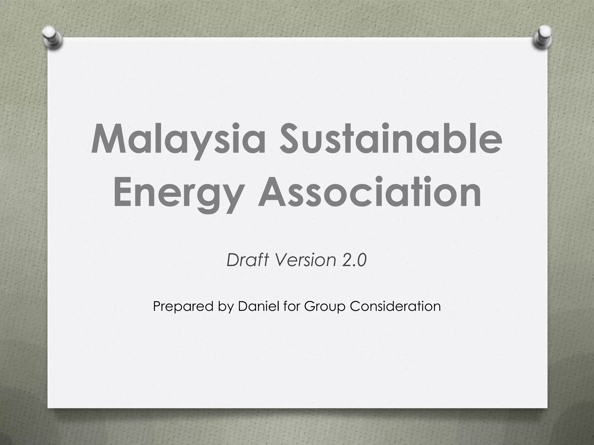 The document outlines the vision, mission, objectives and business model for the proposed Malaysia Sustainable Energy Association. The vision is the promotion of renewable energy and energy efficiency adoption by industry players to meet national energy demand. The mission includes establishing a renewable energy ecosystem and assisting Malaysia's renewable energy and energy efficiency enterprises. The objectives support policies to enhance energy efficiency and renewable energy. The business model describes key activities, partnerships, resources, costs and revenue streams for the association.