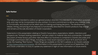 The document outlines the key features and innovations of MySQL 8.0 presented at Oracle OpenWorld 2019, including enhancements like common table expressions, windowing functions, and the new data dictionary designed to improve performance and usability. It discusses the introduction of roles for managing privileges, default character sets, invisible and functional indexes, and better support for JSON data, all aimed at addressing common user requirements. Additionally, it highlights the forward-looking statements regarding Oracle's product future, emphasizing that information is subject to change and should not be the basis for purchasing decisions.