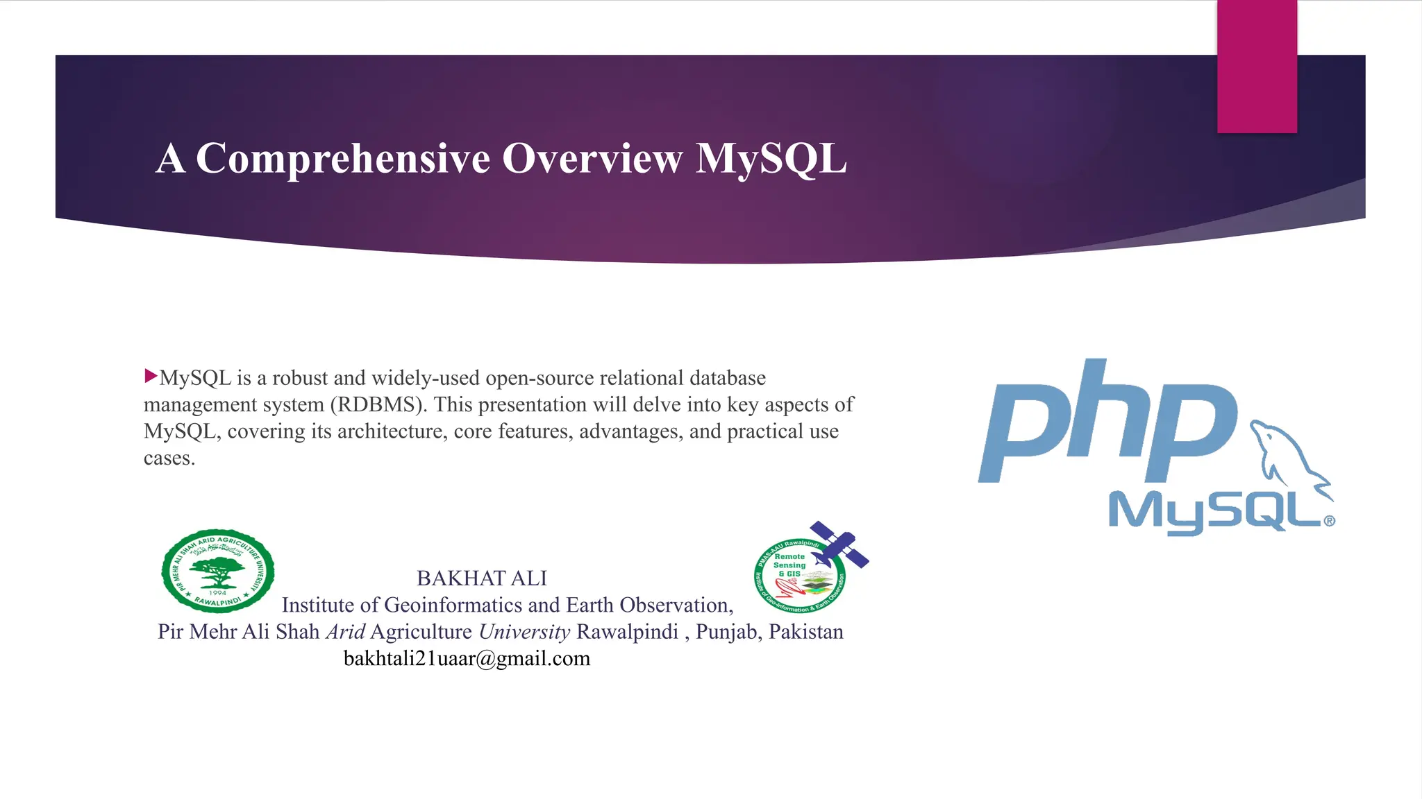 The document provides a comprehensive overview of MySQL, detailing its architecture, core features, advantages, and practical use cases as an open-source relational database management system. Key components include the MySQL server, clients, storage engines, and the query optimizer, which work together to ensure efficient data management. Its performance, scalability, and extensive community support make MySQL a popular choice for various applications, including web development and data analytics.