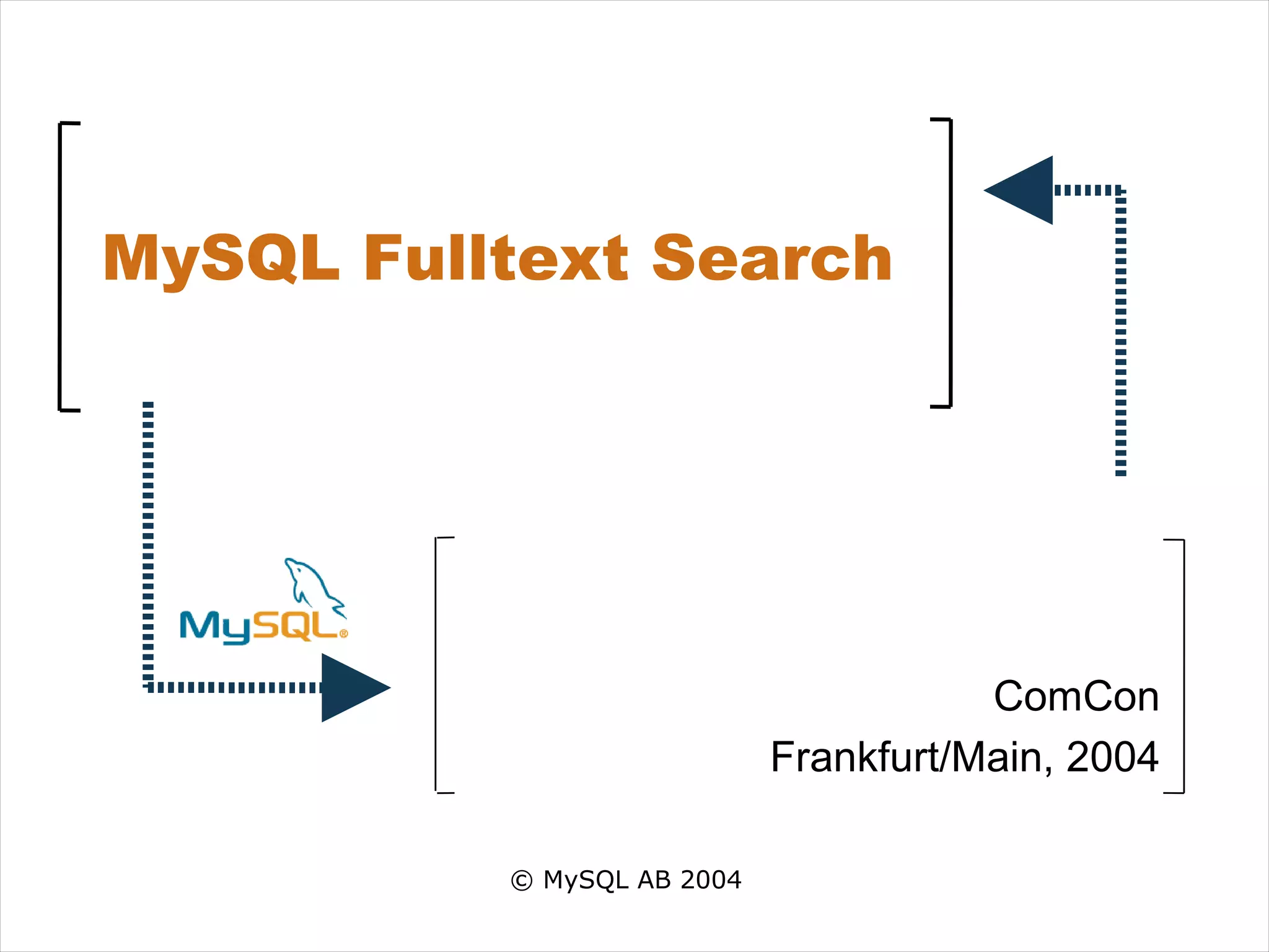 The document provides an overview of MySQL fulltext search capabilities including: - Boolean and natural language search modes, with boolean using query expressions and natural language using free text queries. - Operators for boolean search queries including requiring, excluding, and proximity matching of terms. - Relevance ranking approaches including assigning weights based on term frequency and position. - Features like query expansion for improving recall on short natural language queries.