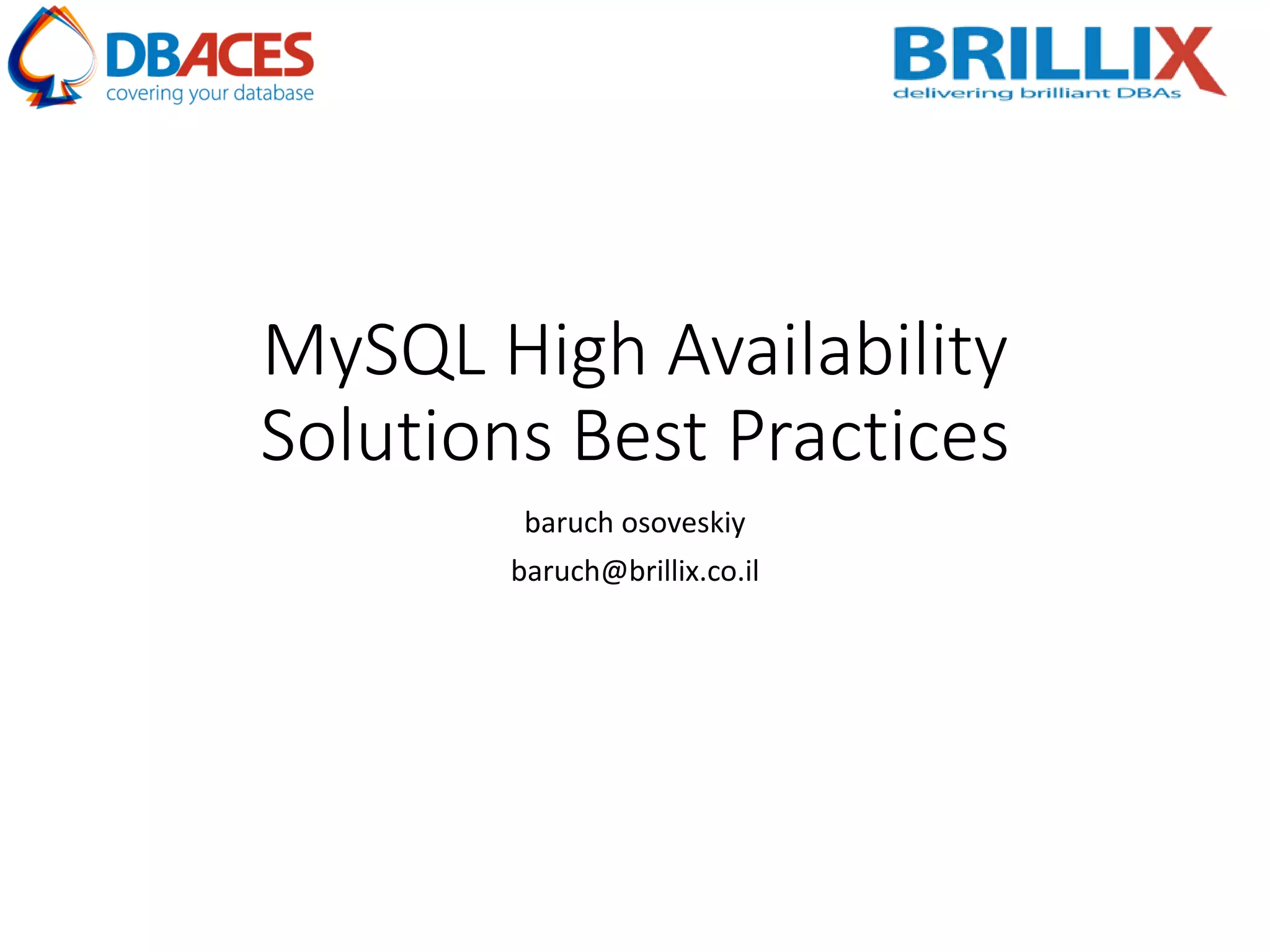 This document discusses various MySQL high availability solutions and best practices. It begins with an introduction to the presenter and their background and experience. Then it discusses the problems of redundancy, scaling, and high availability that these solutions aim to address. Several specific solutions are covered in detail, including Galera Cluster, master-slave replication, MySQL Cluster, Group Replication, MaxScale, MySQL Router, and MySQL InnoDB Cluster. Key features of each are summarized. The document concludes with an invitation for questions.