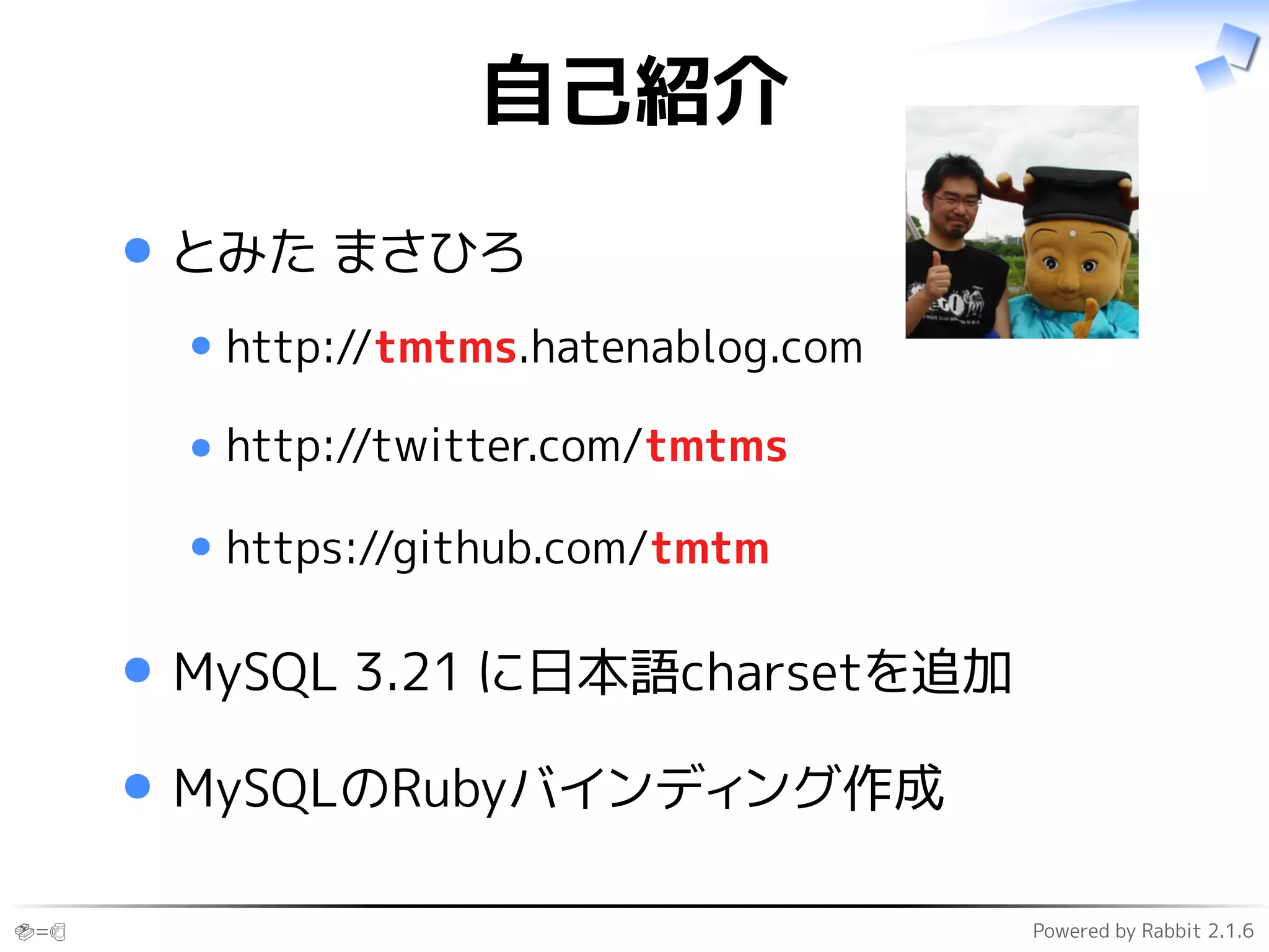 The document is a presentation in Japanese about character sets and collations in MySQL. It discusses how MySQL treats emoji characters like sushi and beer the same by default, but PostgreSQL does not. It explains that MySQL has both a character set (which defines how characters are encoded as bytes) and collation (which defines the sorting rules). For the UTF-8 character set, it shows the different collation options and how they treat letters, emojis, hiragana/katakana, and case sensitivity differently. It expresses a need for a Japanese-specific collation that properly distinguishes Japanese characters.
