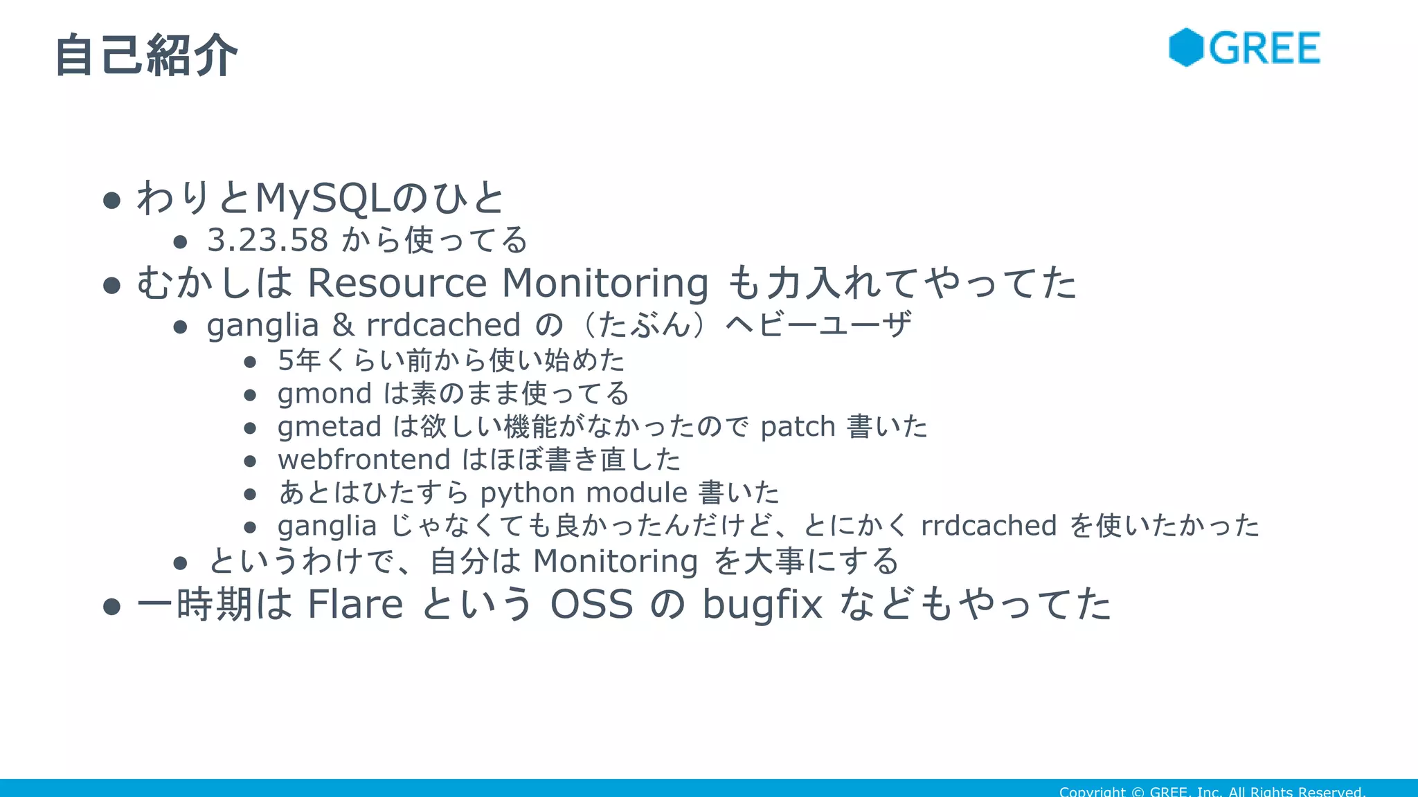 から使ってる ● むかしは Resource Monitoring も力入れてやってた ● ganglia & rrdcached の(たぶん)ヘビーユーザ ● 5年くらい前から使い始めた ● gmond は素のまま使ってる ● gmetad は欲しい機能がなかったので patch 書いた ● webfrontend はほぼ書き直した ● あとはひたすら python module 書いた ● ganglia じゃなくても良かったんだけど、とにかく rrdcached を使いたかった ● というわけで、自分は Monitoring を大事にする ● 一時期は Flare という OSS の bugfix などもやってた