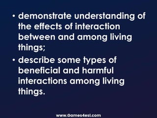 1. The document discusses different types of interactions between living things including mutualism, commensalism, predation, parasitism, and competition.
