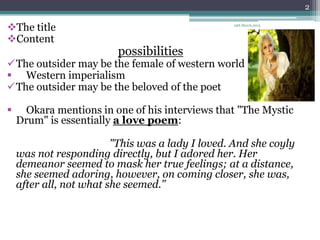The document provides a critical analysis of the poem "Mystic Drum" by Gabriel Okara, discussing possible interpretations of the outsider character and themes in the poem such as nature, the killing of innocence, and problems in society. It examines how the outsider could represent a western woman, the poet's beloved, or Eve, and analyzes imagery related to nature, pollution, and deforestation. In interviews, Okara stated the poem is essentially a love poem about a lady he admired who seemed coy yet adoring from a distance.