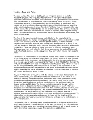 The document discusses the difference between true mystics/sadhus and false ones in India. It notes that for thousands of years, sincere ascetics have lived alongside clever imposters who use the guise of spirituality for selfish gains. While most holy men practice asceticism out of faith or desire for enlightenment, some study scriptures and techniques only to convincingly fake supernatural abilities and attract followers for money and fame. It is difficult for ordinary people to distinguish the genuine from the fraudulent mystic.